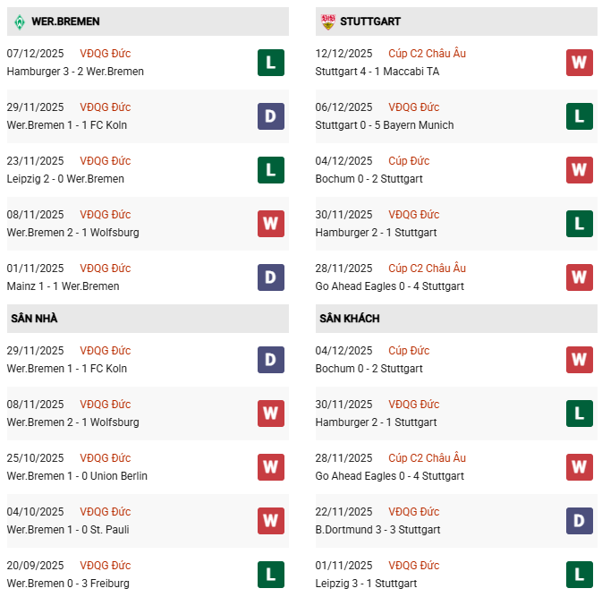 Vòng này, Stuttgart còn phải làm khách mà hãy nhớ rằng 7 trận xa nhà đã qua thuộc Bundesliga 2025/26, họ khải hoàn có 2 lần - thống kê không thể đáng tin cậy trong bối cảnh phải "nằm trên" (tức chỉ chiến thắng mới là đạt yêu cầu). Mà nhìn lại quá khứ từ năm 2007 tới giờ, Stuttgart mới 1 lần rời khỏi sào huyệt của Werder Bremen với niềm vui trong tay.