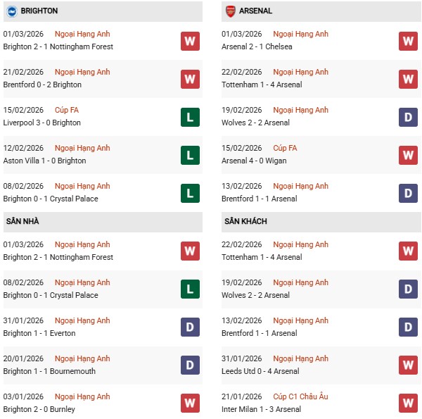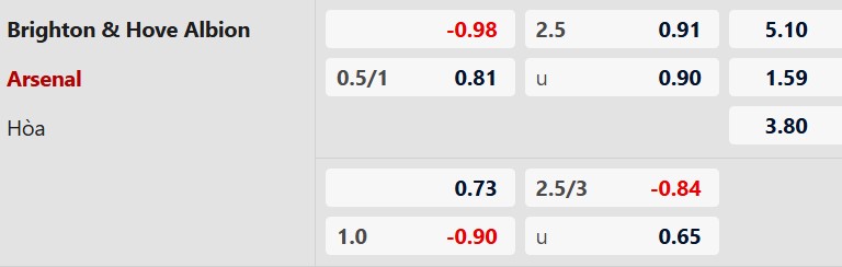 Đối đầu thuận lợi: Arsenal đã thắng Brighton trong cả 2 lần chạm trán gần nhất (bao gồm trận thắng 2-1 ở lượt đi mùa này và một trận tại League Cup).