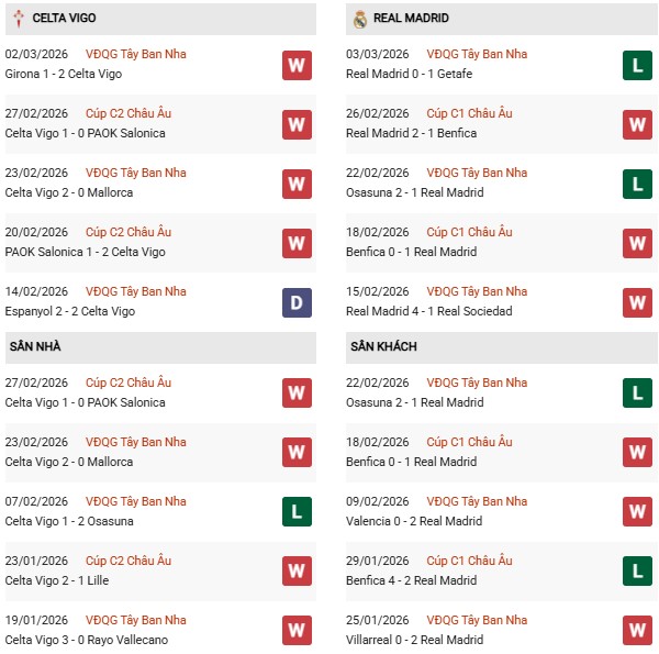 Thống kê phong độ Celta Vigo vs Real Madrid: