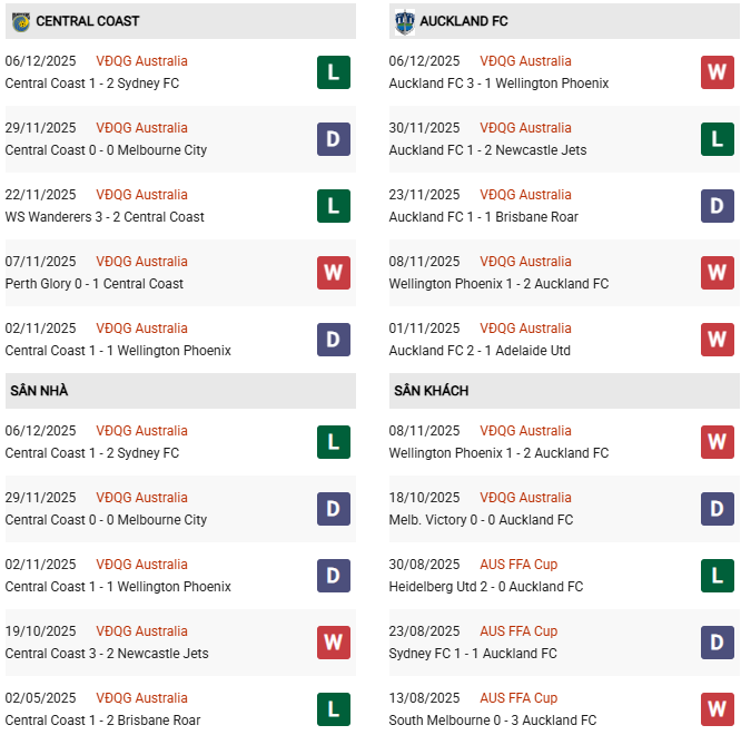 Thống kê phong độ Central Coast vs Auckland FC: