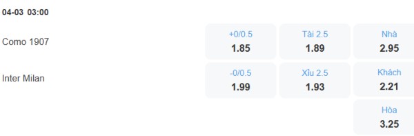 Ở cả 3 trận đối đầu với Inter thì Como đều không thể ghi bàn, họ cũng không để thủng lưới nhiều. Trong bối cảnh hàng thủ của cả 2 đội đều chơi ổn thì trận đấu sắp tới sẽ có ít bàn thắng được ghi. Nên chọn kèo Xỉu thì cơ hội thắng cuộc cao hơn.