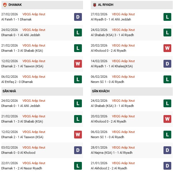 Sau 24 vòng đấu Damac có 2 chiến thắng, 10 trận hòa và 12 thất bại, ghi 18 bàn và thủng lưới 41 bàn, hiệu số âm 23. Al Riyadh có 3 chiến thắng, 7 trận hòa và 14 thất bại, ghi 22 bàn và thủng lưới 45 bàn, hiệu số cũng âm 23. Những con số này cho thấy sự tương đồng khá rõ ràng giữa hai đội cả về phong độ lẫn hiệu suất ghi bàn và phòng ngự.