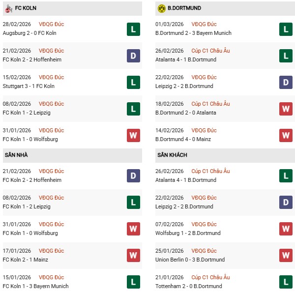 - FC Koln thắng 2, hòa 2, thua 6 trong 10 trận gặp Dortmund gần đây.