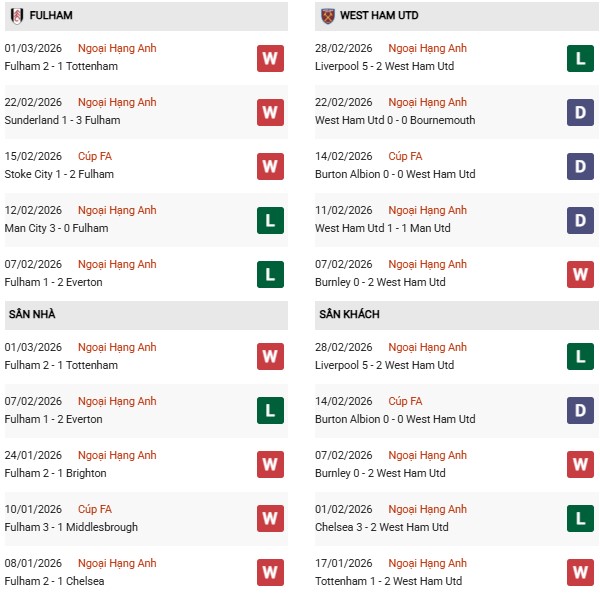 Thống kê phong độ Fulham vs West Ham: