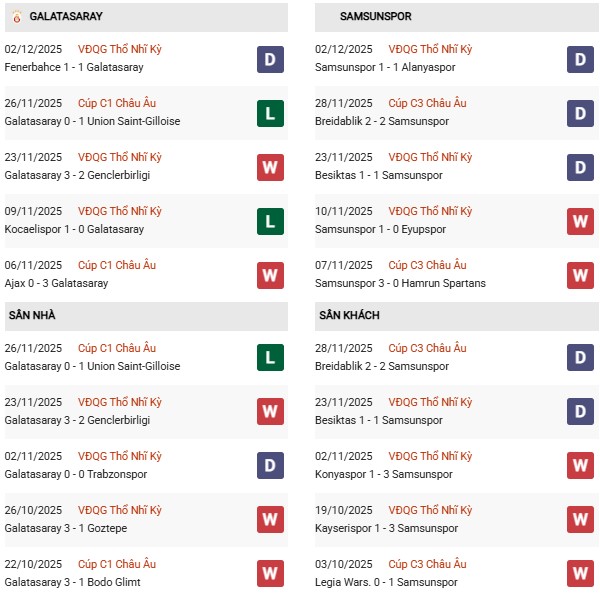 Thống kê phong độ Galatasaray vs Samsunspor: