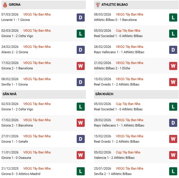 Thống kê phong độ Girona vs Bilbao:
