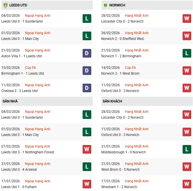 Thành tích đối đầu: Leeds hoàn toàn áp đảo khi bất bại trong 8 lần chạm trán Norwich gần nhất, trong đó có 6 chiến thắng. Tại Elland Road, Leeds cũng đã thắng cả 4 lần tiếp đón "Chim hoàng yến" gần đây.