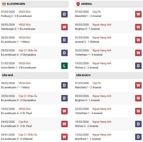 Bayer Leverkusen bước vào trận đấu với phong độ khá thất thường khi chỉ ghi 5 bàn trong 5 trận gần nhất, cho thấy hàng công chưa thật sự ổn định.Trong khi đó, Arsenal đang có chuỗi phong độ ấn tượng với 5 trận bất bại liên tiếp và ghi tới 11 bàn, thể hiện khả năng tấn công hiệu quả.