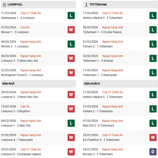 Liverpool: Đang giữ vững hình ảnh "pháo đài" Anfield khi chỉ thua 1 trong 11 trận sân nhà gần nhất. Dù vừa có cú sảy chân tại Cúp C1 (thua Galatasaray 0-1), nhưng tại đấu trường quốc nội, The Kop vẫn đang duy trì sức mạnh đáng nể. Lịch sử đối đầu cũng ủng hộ tuyệt đối khi họ chỉ thua 1 trong 16 lần gặp Spurs gần đây tại Ngoại hạng Anh.