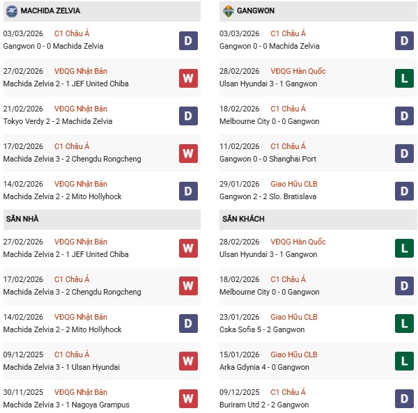 Thống kê phong độ Machida Zelvia vs Gangwon: