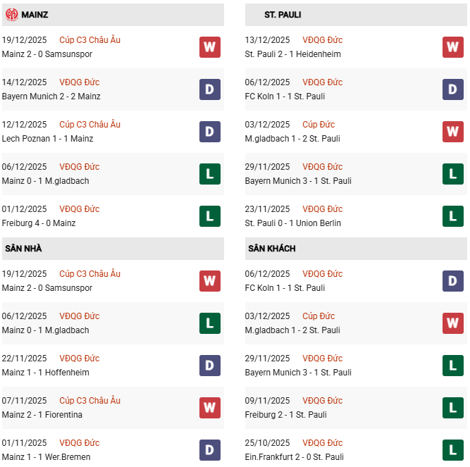 - 7 trận đối đầu vừa qua, Mainz thắng 5 thua 1 và hòa 1 trước St. Pauli.