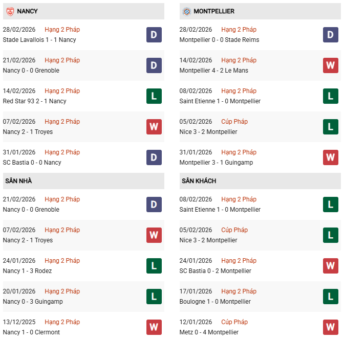 Lợi thế đối đầu nghiêng về đội khách: Montpellier thắng 5/6 lần gặp Nancy gần nhất, bao gồm chiến thắng 4-1 ở lượt đi. Tuy nhiên, phong độ thực tế hiện tại của cả hai đều không quá nổi bật để có thể áp đặt thế trận hoàn toàn.