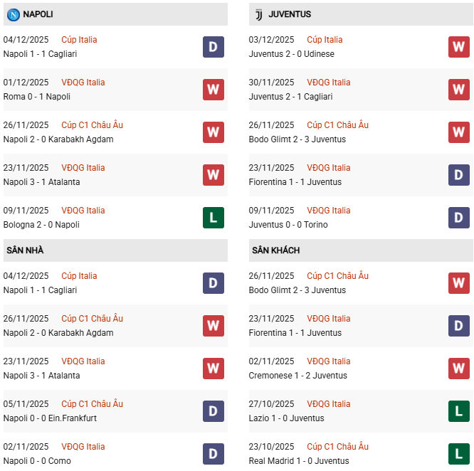 Thống kê phong độ Napoli vs Juventus: