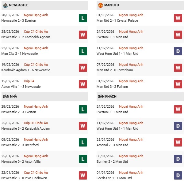 Thống kê phong độ Newcastle vs MU: