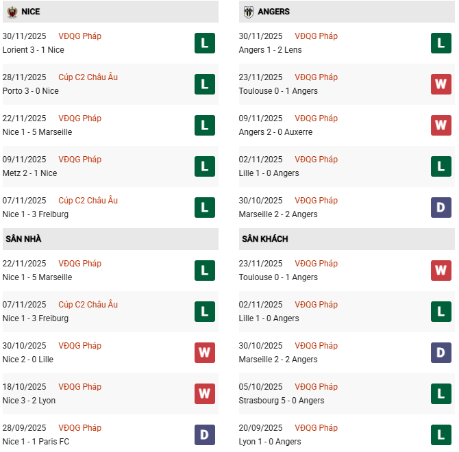 Thống kê phong độ Nice vs Angers: