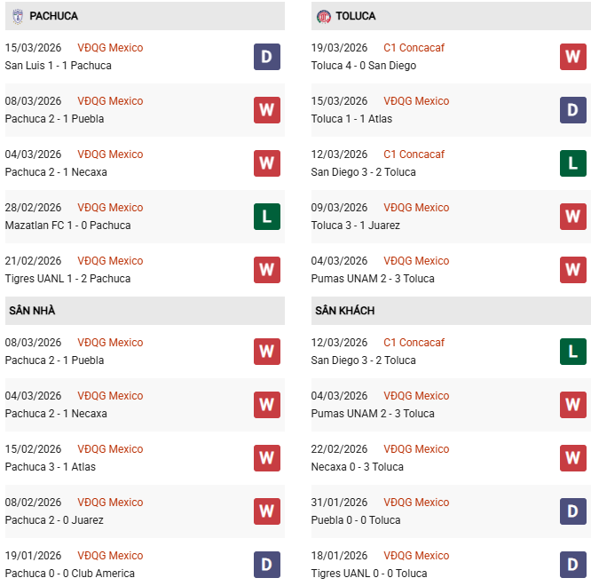 Vòng này, Toluca sẽ phải làm khách của Pachuca - đối thủ đang đứng phía sau với 4 điểm ít hơn tức phong độ tổng thể không đến mức quá thua kém. Thực tế, Pachuca mới 2 lần trắng tay sau 11 vòng tại Clausura 2026 và cả hai thất bại đều trên sân khách.