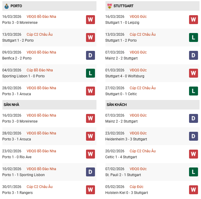 Thống kê phong độ Porto vs Stuttgart: