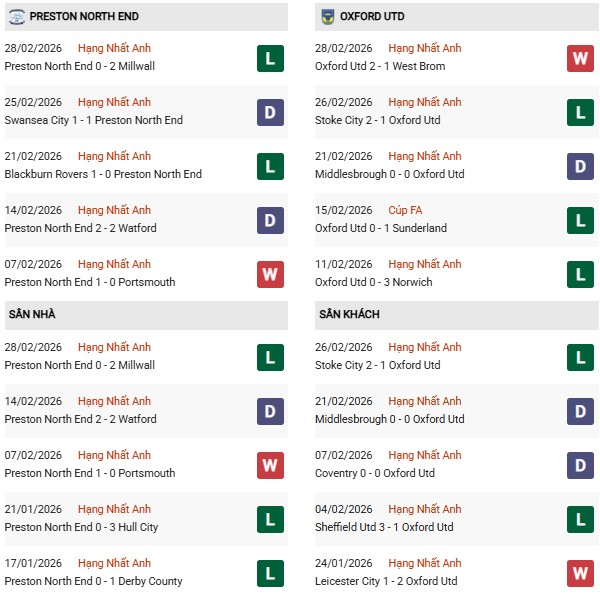 Thống kê phong độ Preston vs Oxford United: