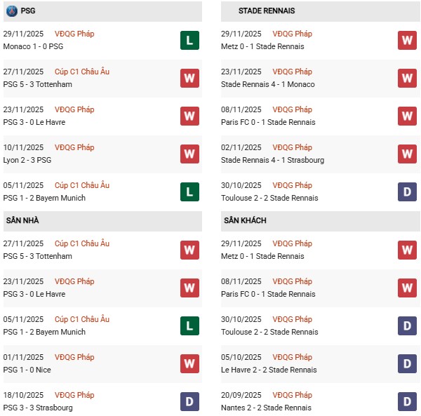 PSG đang thể hiện sức mạnh đáng nể tại giải quốc nội. Trong 5 trận gần nhất, đội chủ sân Công viên các Hoàng tử giành 3 chiến thắng, 1 trận hòa và chỉ thua 1 trận. Lối chơi kiểm soát bóng chủ động, pressing tầm cao và khả năng chuyển trạng thái cực nhanh đang giúp PSG trở nên nguy hiểm hơn bao giờ hết. Phong độ ổn định này giúp họ có 30 điểm sau 14 vòng đấu và tạm xếp ở vị trí thứ 2, chỉ kém đội dẫn đầu Lens đúng 1 điểm. Vì vậy, cuộc đối đầu Rennes là cơ hội vàng để PSG tiếp tục bám đuổi và gây áp lực lên ngôi đầu bảng.