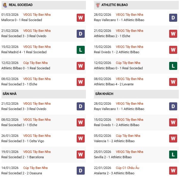 Thống kê đối đầu Real Sociedad vs Athletic Bilbao: