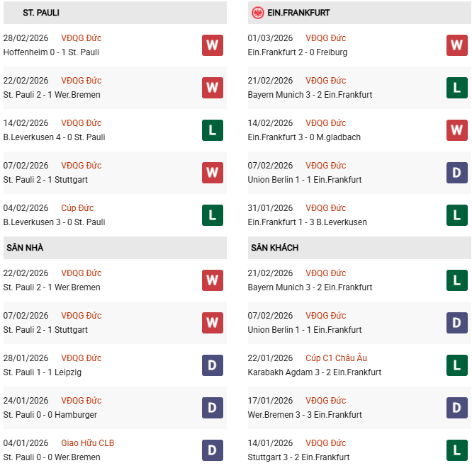 - St Pauli thắng 1, hòa 2, thua 5 trong 8 trận gặp Frankfurt gần đây.