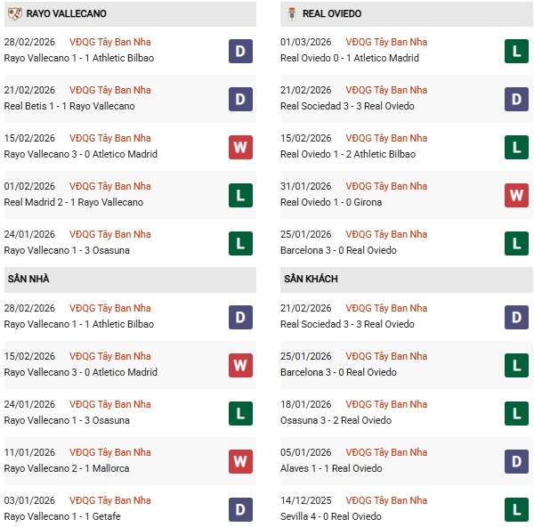 Thống kê phong độ Vallecano vs Oviedo: