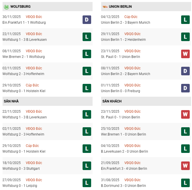 Thống kê phong độ Wolfsburg vs Union Berlin:
