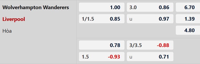Sự chênh lệch đẳng cấp: Wolves dù vừa thắng Aston Villa 2-0 nhưng vẫn đang đứng ở nhóm cuối bảng xếp hạng (hạng 20 hoặc bét bảng theo một số thống kê). Hàng công của họ kém nhất giải (chỉ ghi trung bình 0.6 bàn/trận) sẽ rất khó để xuyên thủng hệ thống của Liverpool dù đội khách đang thiếu vắng một vài trụ cột.