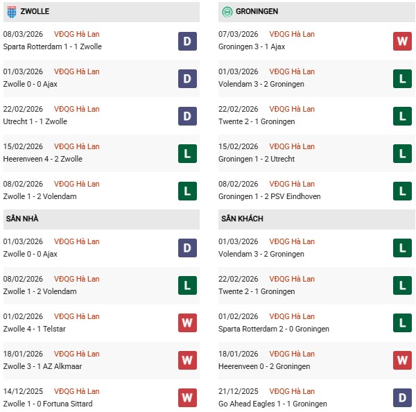 - 10 trận đối đầu gần nhất giữa 2 đội, Zwolle thắng 4, thua 1 trước Groningen.