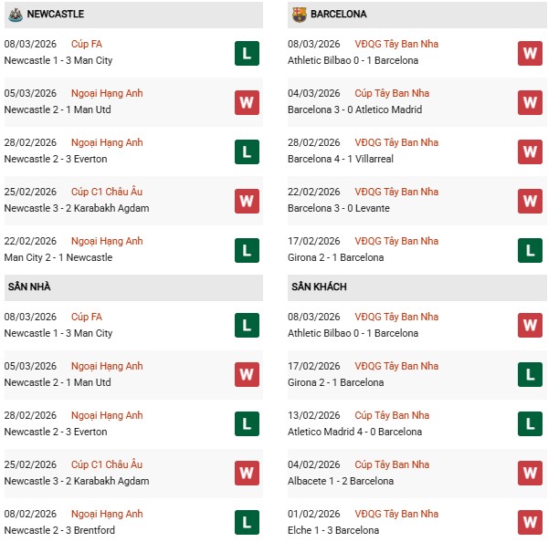 Thống kê phong độ Newcastle vs Barca: